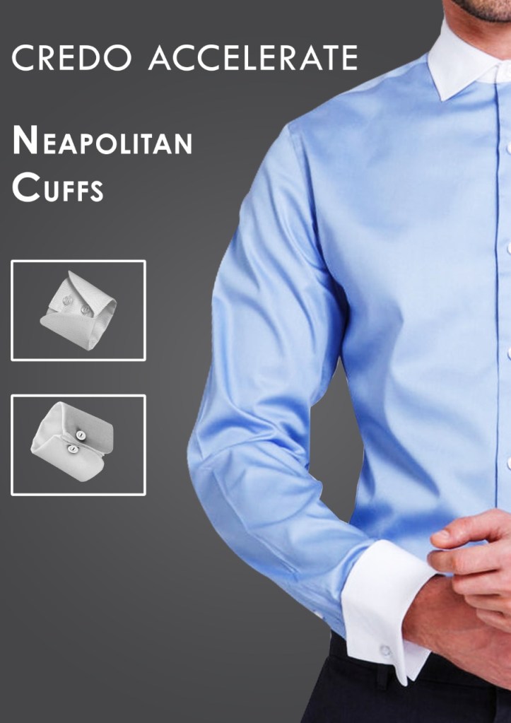 Neapolitan cuffs are practical and stylish, a road to finish the sleeve on shirts for men. It is distinguished by the combination of a button closure and cutaway fold back. These cuffs are perfect for summer weddings especially on a beach, dressier garden parties and of course, after work cocktails parties with the cocktail shirts for men cuffs. These cuffs are the settlement between Buttoned cuffs and the Link cuffs. It does not fold back on itself and it is fastened with buttons. These shirts for men cuff sometimes have an interior colour that remains visible inside the fold. CREDO ACCELERATEshirts for men with Neapolitan cuffs can be worn for a casual look with a tie and a pair of jeans.