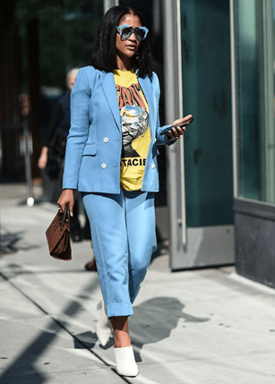 A luxe blazer over an edgier graphic T-shirt paired with jeans pulls off that “high-low” look. It’s an effortless ‘fit that’s both casual and dressed up, no matter where you’re heading.